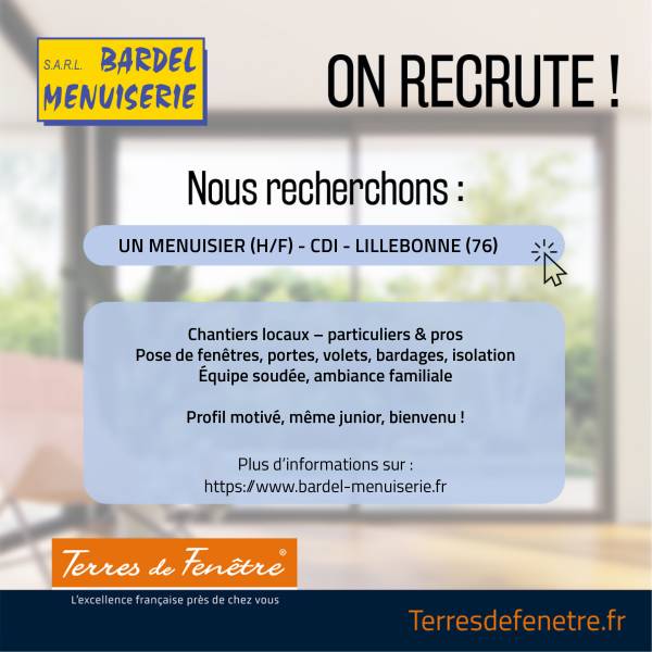 Bardel Menuiserie recherche un menuisier poseur, pour réaliser des chantiers locaux, chez nos clients, particuliers et professionnels.